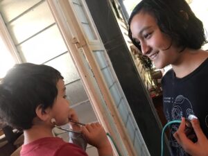 Hiro entendendo onde fica o coração - Enfim, terminamos escutando o coração do irmão mais velho, Enzo. Usamos o meu estetoscópio mas, se você não tiver pode fazer um igual a esse. Parece bem divertido! Colocando também a mão ou o ouvido direto sobre o peito, funciona da mesma forma :).