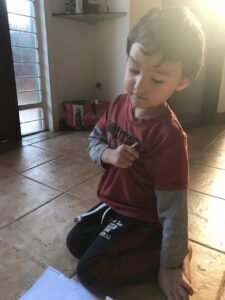Coração, artérias e veias no nosso esqueleto - Logo em seguida, Hiro aperta o peito e diz: “aqui fica o meu coração”. Achei muito bom ver que ele vai associando o que estamos falando com o corpo dele. Esse é o objetivo!