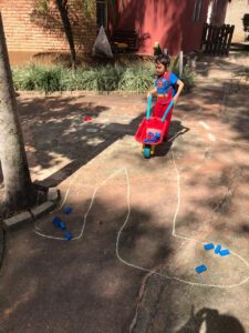 Desenho do corpo humano com o coração - Começamos a brincadeira, desenhando um corpão gigante com o coração no nosso quintal. Se você mora em um apartamento, pode usar fita crepe para desenhar no piso, assim não marca o chão. E, não se preocupe com a fidelidade do desenho, seu filho vai entender.