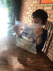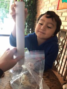 - Depois, pegamos um rolo de papel toalha vazio, um saco plástico com fecho e água dentro e, pedacinhos de pão. Em outras palavras, o rolo simula o esôfago, o saco plástico o estômago, a água o suco gástrico e os pedacinhos de pão a comida.