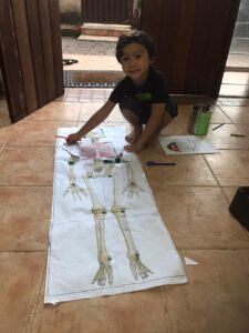 Hiro carregando o “oxigênio” por todas as partes do corpo - Num outro dia, colocamos nosso pulmão no nosso corpinho. Imprimimos este pulmão do tamanho de uma folha A4 e cortamos com estilete a caixa torácica, abrimos e colocamos o pulmão por baixo. A primeira coisa q ele me perguntou, apontando para o tórax: “Então o pulmão fica aqui, não é mamãe?”. Respondi que sim e entendi que a lição de onde é que fica o pulmão foi dada.