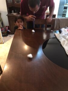 O pulmão no nosso esqueleto - Com o auxílio do Papai, fizemos uma brincadeira, de como podemos controlar o ar nos pulmões. Com um canudo, fizemos uma corrida de algodão. Coloquei uma linha de chegada no final da mesa e os dois ficaram soprando os algodões até chegar no fim. Eles se divertiram muito.