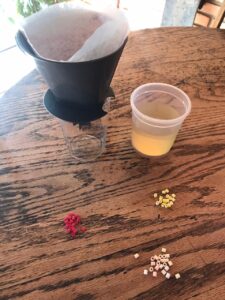 preparando o “sangue” - Em seguida misturamos tudo e filtramos da mesma forma que o rim faz com o sangue! Em outras palavras, simulamos que as partes boas que o corpo necessita ficaram no filtro e as que a gente não precisa, foram eliminadas como urina (um liquido amarelado)! Essa brincadeira fez muito sucesso! Como resultado, Hiro passou horas filtrando e fazendo nosso “xixi”.