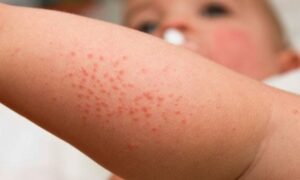 Ora, mas essa não era a definição da miliária? Parece, mas não é. Enquanto a miliária dá origem a bolhinhas mais delicadas, a alergia causa manchas vermelhas mais grosseiras, com aspecto inflamado e inchaço da região. A localização mais comum das lesões é no tórax e no pescoço, mas elas podem se espalhar por toda parte.