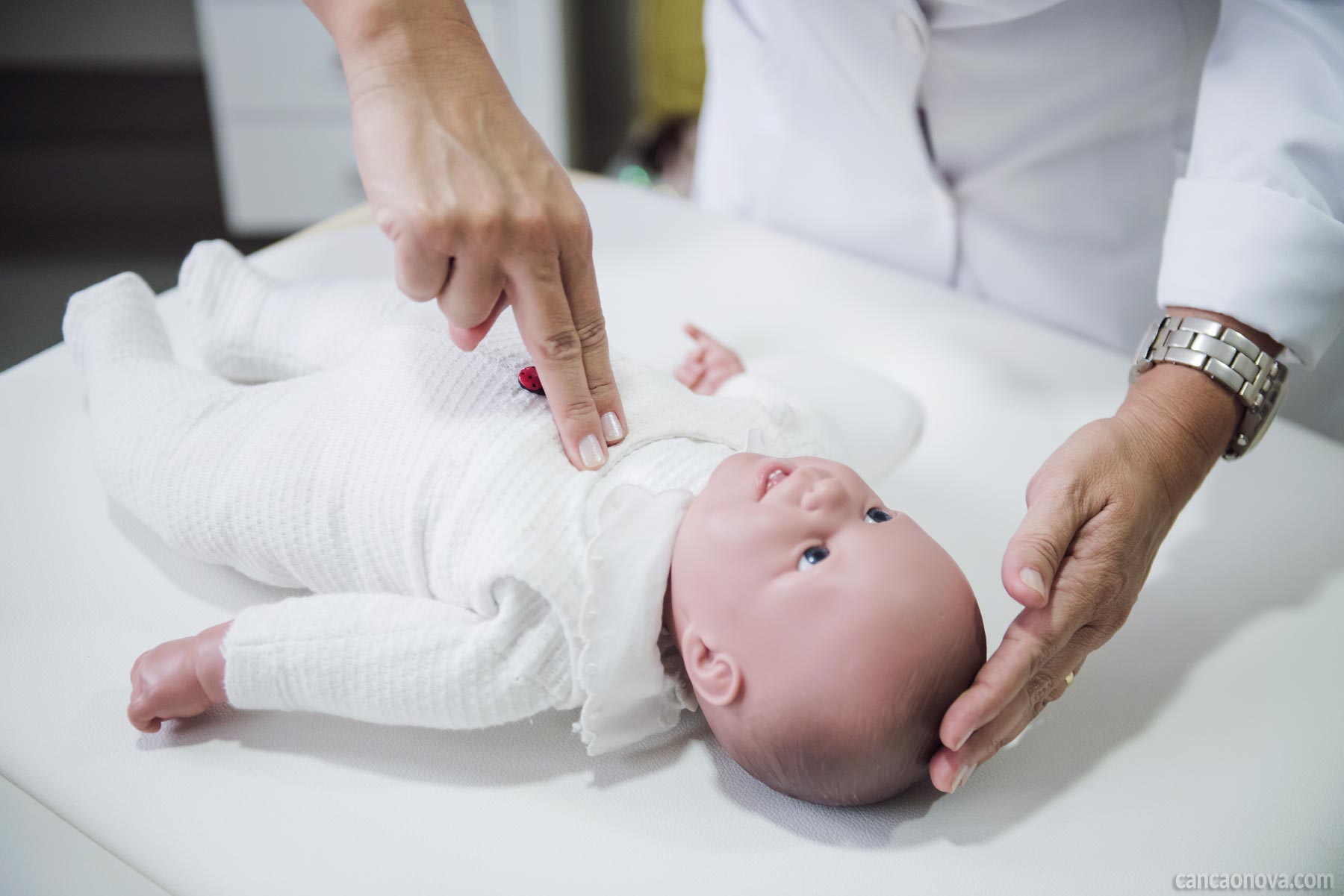 Portanto, essa manobra vai produzir uma tosse artificial, que ajuda a eliminar o que está obstruindo as vias aéreas. Por fim, vire a criança de barriga para cima e comprima com 3 dedos a região do tórax entre os bracinhos.