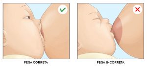 Mas, afinal, como é uma boa pega? Para isso, o baby deve manter o lábio inferior para fora, ou seja, evertido. Em outras palavras, é como se fizesse uma “boquinha de peixe”. O queixo deve tocar a mama da mãe e a sucção deve ser profunda e sem pausas.